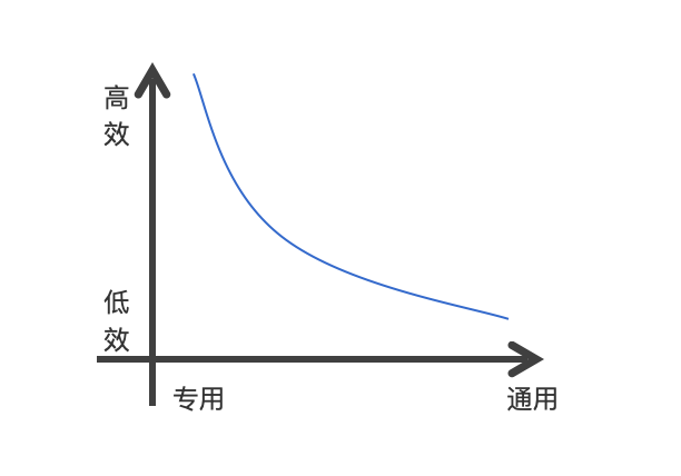 好了,我们现在可以总结一下这部分了。效率和通用是两个相互制约的维度,无法同时获得,两者的关系可以定性地用下图来体现: