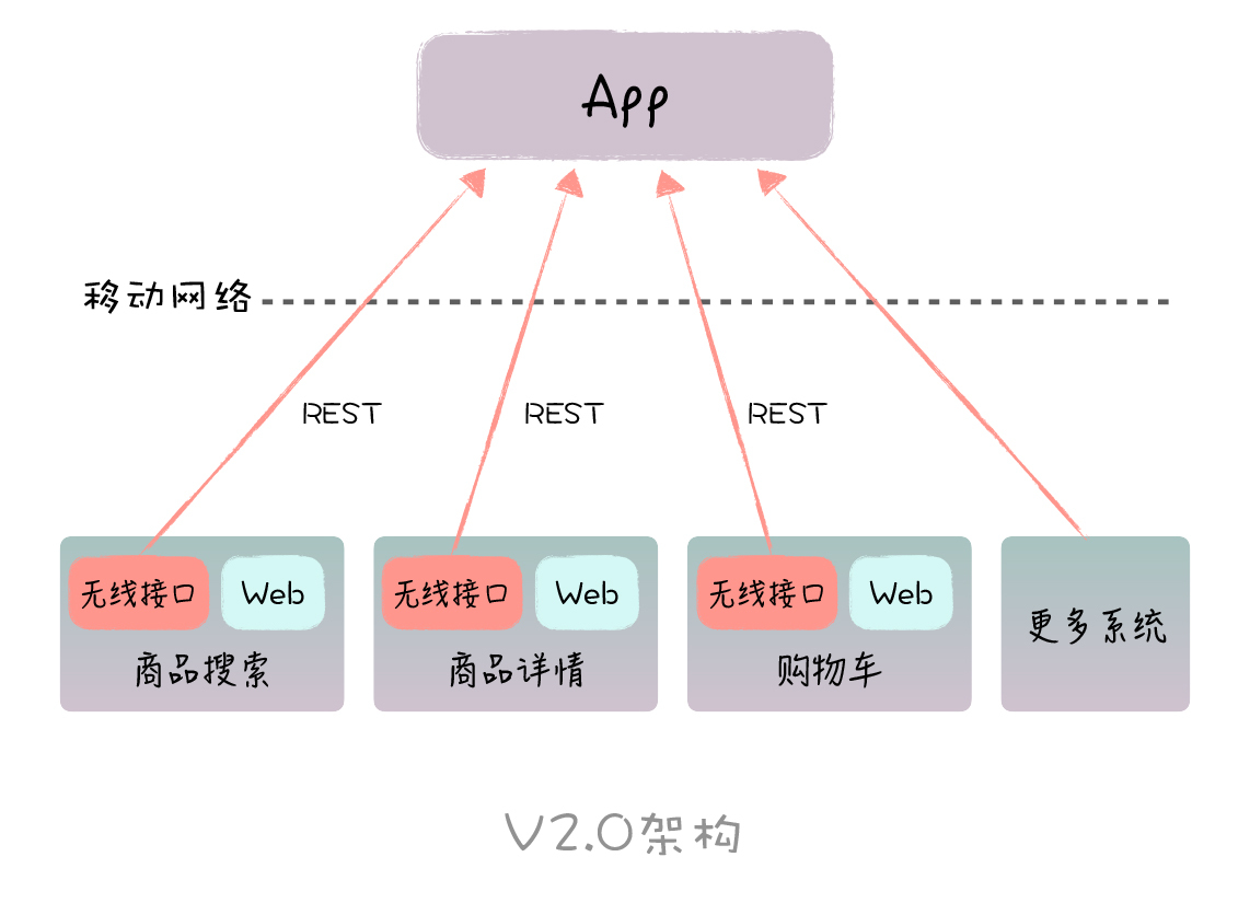 这个架构比较简单,App的服务端整体上就一个应用,由移动团队来维护所有对外接口,服务端内部有很多Jar包,比如商品搜索、商品详情、购物车等等,这些Jar包包含了各个业务线的业务逻辑及数据库访问,它们由各个业务线的开发者负责提供。