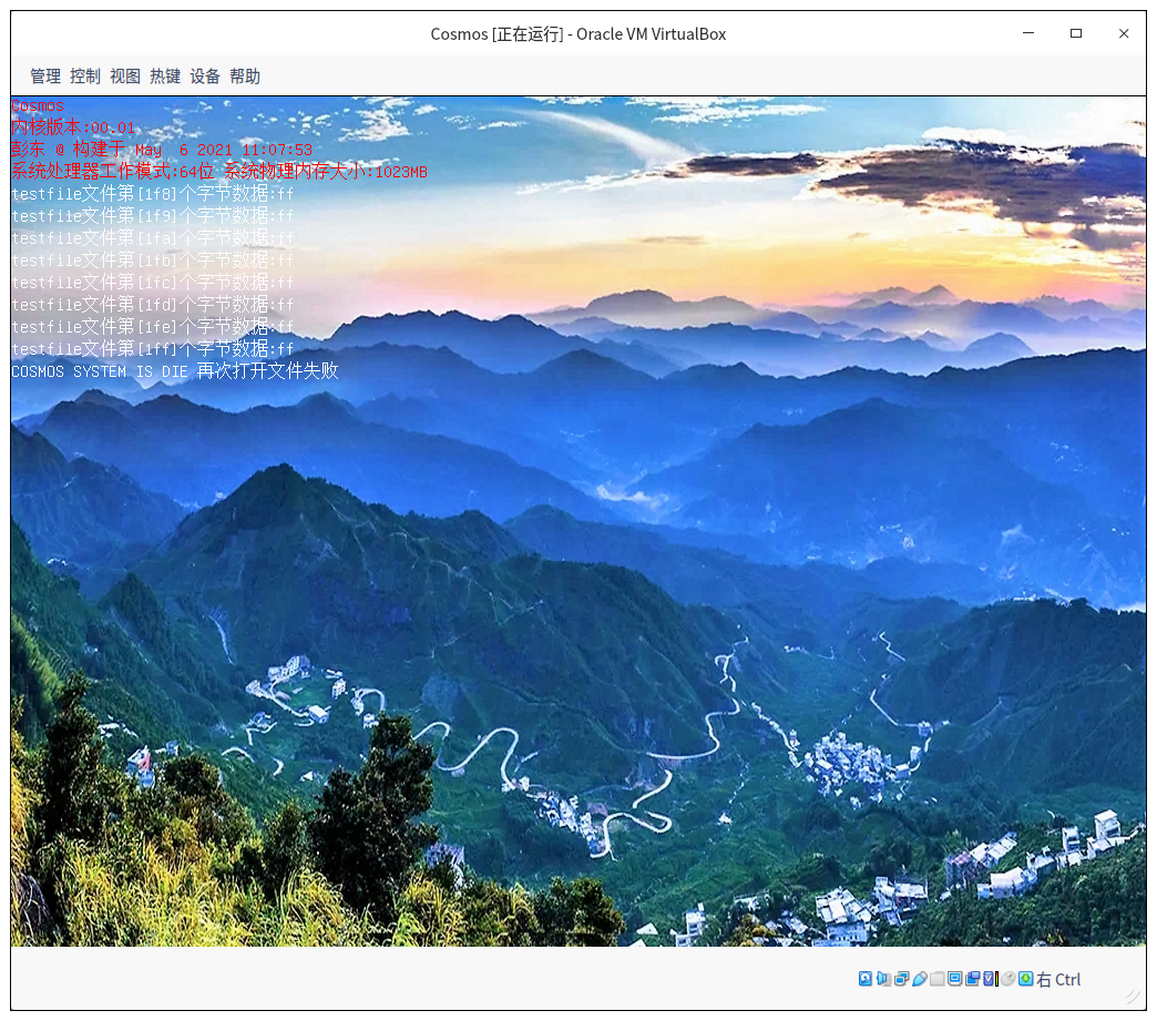 现在我们把test_fsys函数放在rfs_entry函数的最后调用,然后打开终端切换到cosmos目录下执行make vboxtest 命令,最后不出意外的话,你会看到如下图所示的情况。