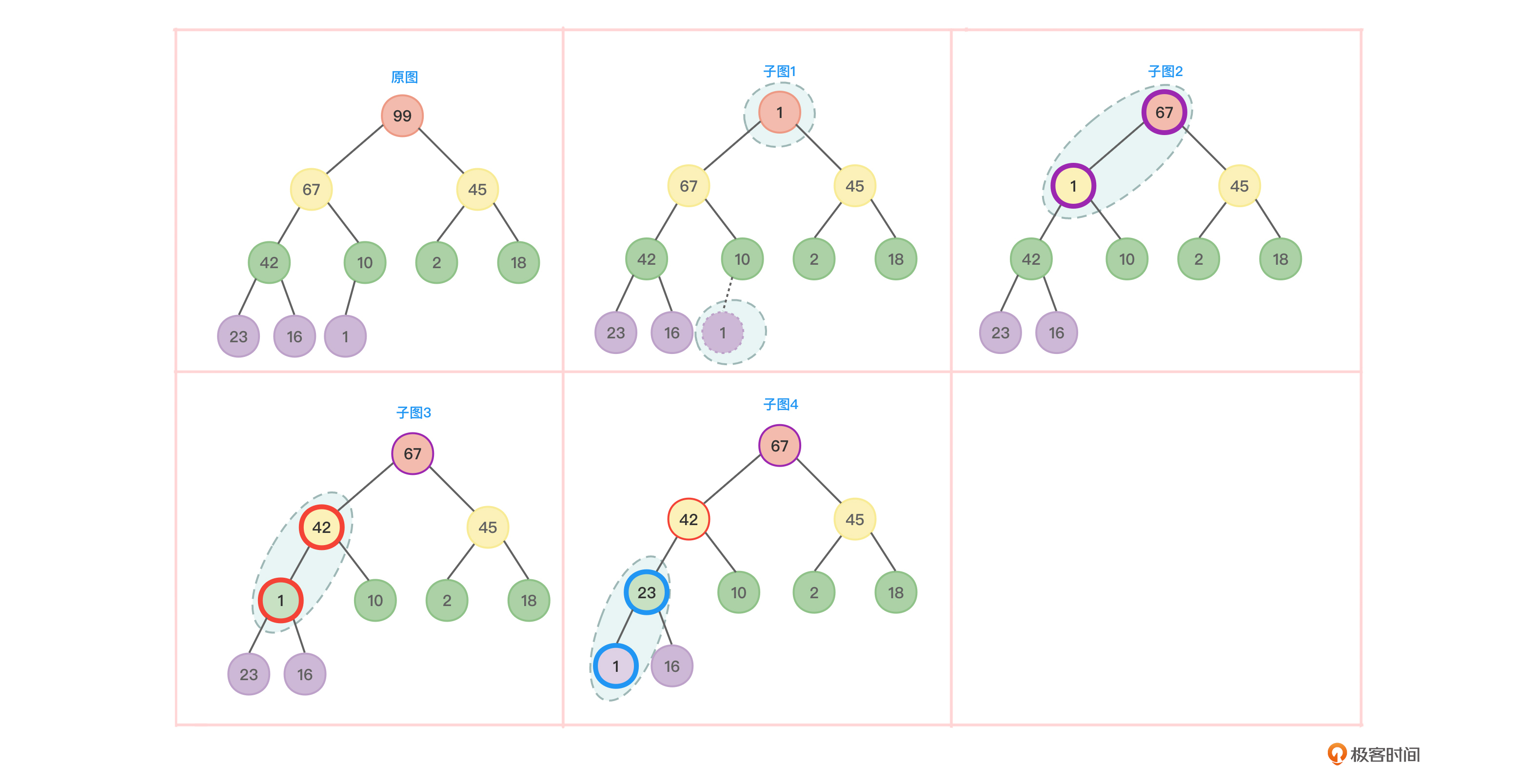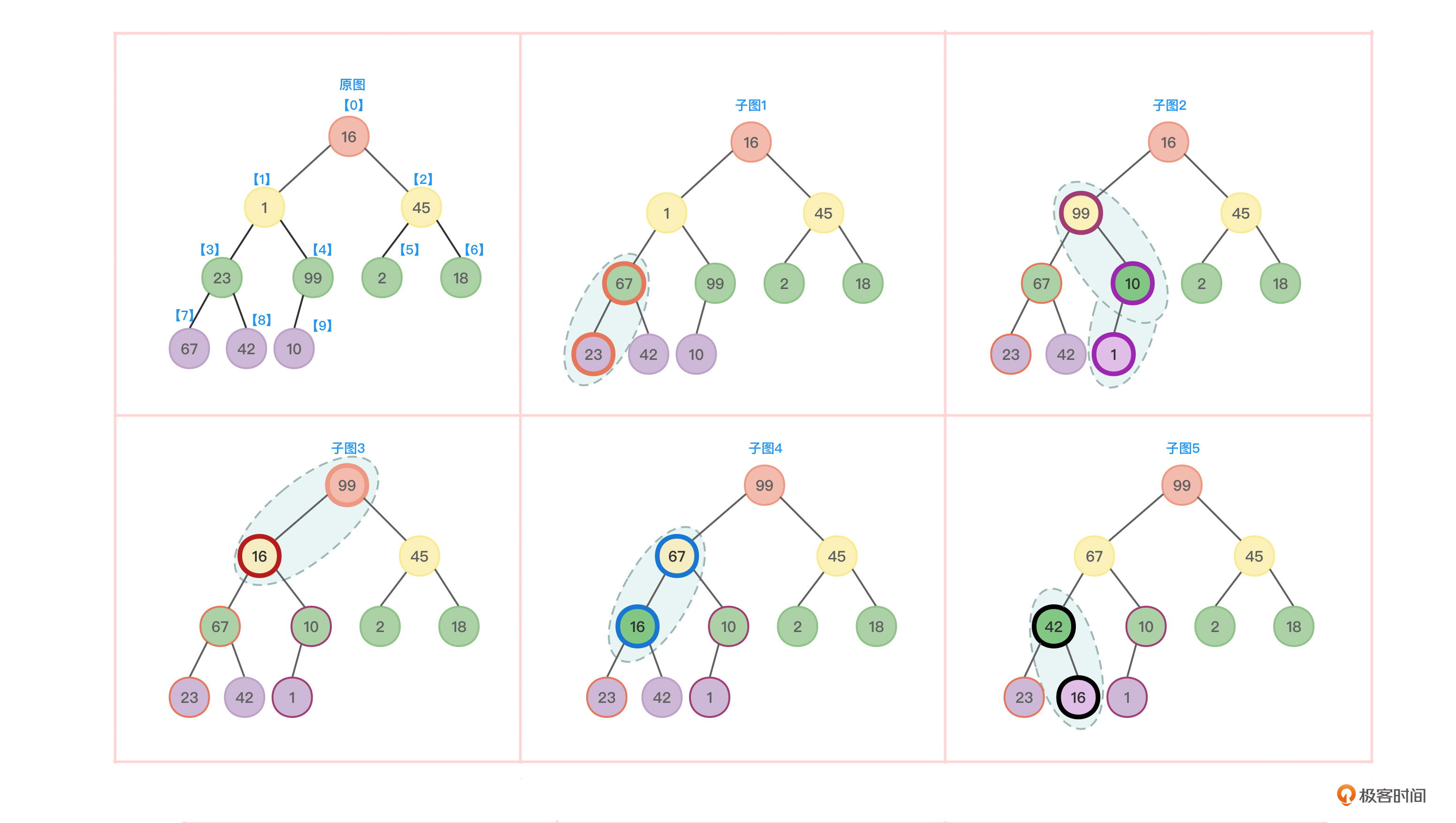 - 以16为根的子树不满足大顶堆要求,因此节点16和节点99的值互换,如图6中的子图3。