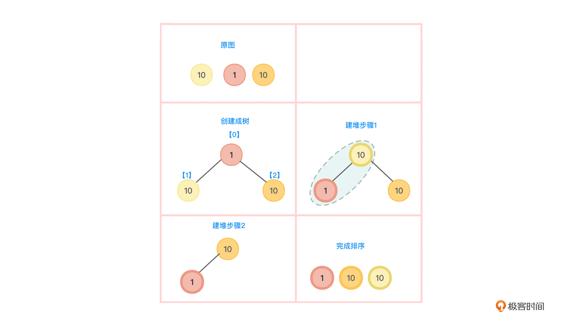 图1左上侧是待排序的10个元素,我们以从小到大排序来说明。