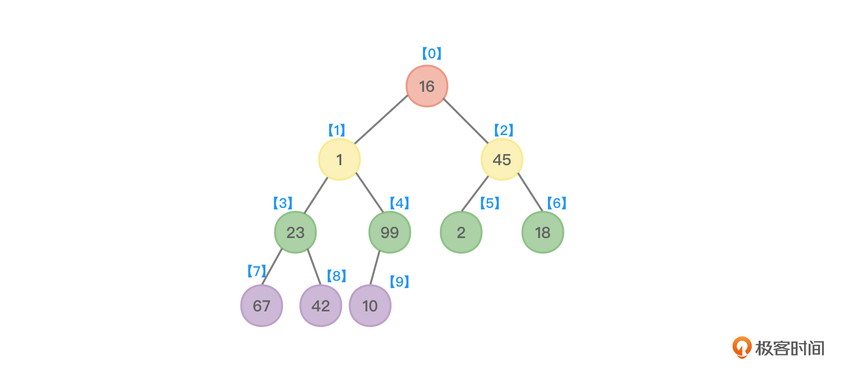 以数组{ 16,1,45,23,99,2,18,67,42,10 }为例,先来创建一棵完全二叉树,参考图5: