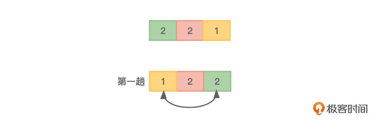 此外,该算法是不稳定的,只需要用一组数据2、2、1测试一下即可知道。如图2所示,前两个元素在排好序之后位置已经调换了。