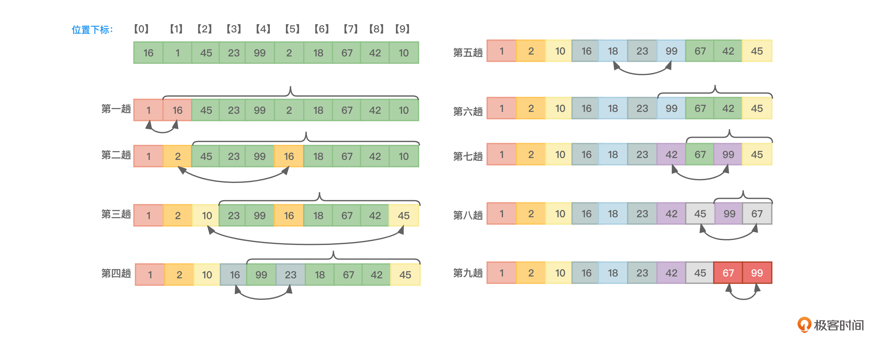 - 如此重复,第九趟排序:抛开下标为0、1、2、3、4、5、6、7位置的元素,从其余元素中找出值最小的元素和下标为8的元素做交换,这样下标为8位置所保存的就是剩余待排序元素中最小值的元素。此时,下标为9的元素自然就是值最大的元素。