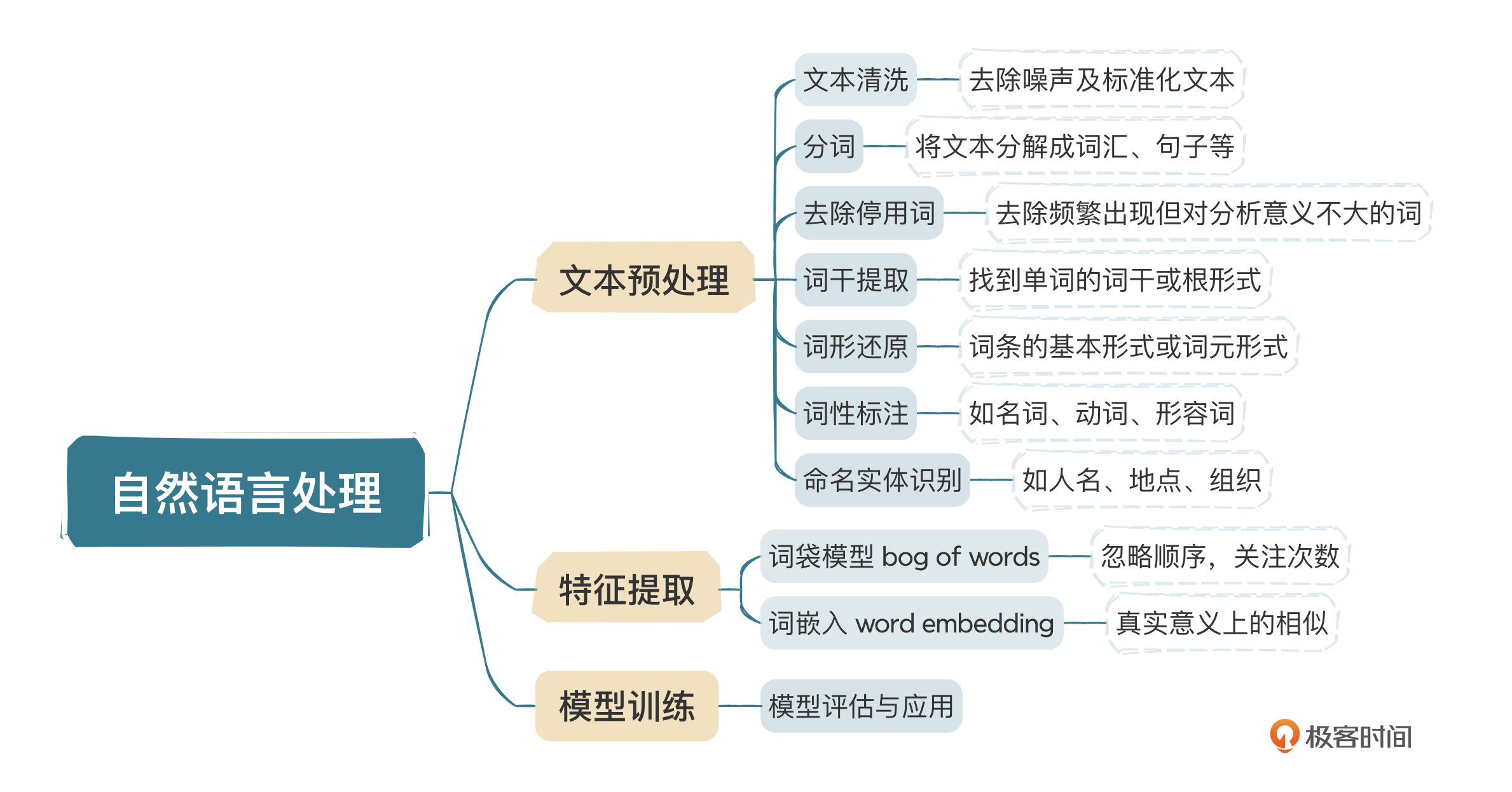 这节课我们主要学习了自然语言处理(NLP)相关的基本概念,结合之前学习的机器学习的基本概念,可以算是入门了,如果拿学习Java来举例的话,我们应该是把类、变量、数据类型、接口等概念看完了,后面就是实操了。最后我们通过一张脑图回顾一下这节课学到的知识。