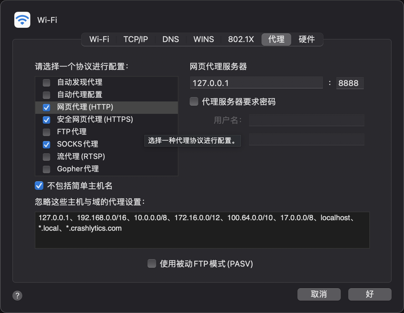 举一个例子,在我的Mac电脑上(Windows类似)就可以设置系统代理。这样我在浏览器上发送的所有HTTP/HTTPS请求都会被转发到代理服务器的地址127.0.0.1:8888中。