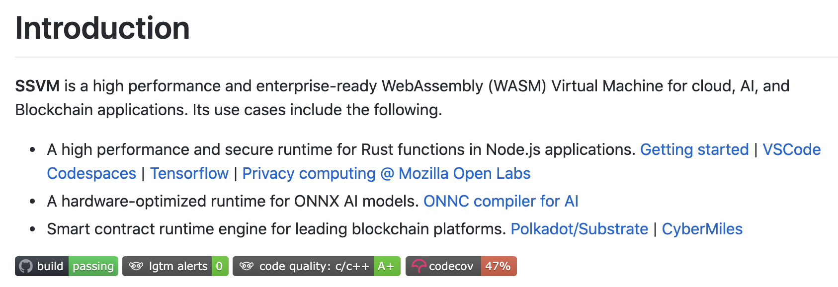 SSVM 的 Wasm 运行时针对 ONNX AI 模型进行了硬件优化。同时也可以作为区块链平台的智能合约运行时引擎。关于它的更多信息可以查看这里。