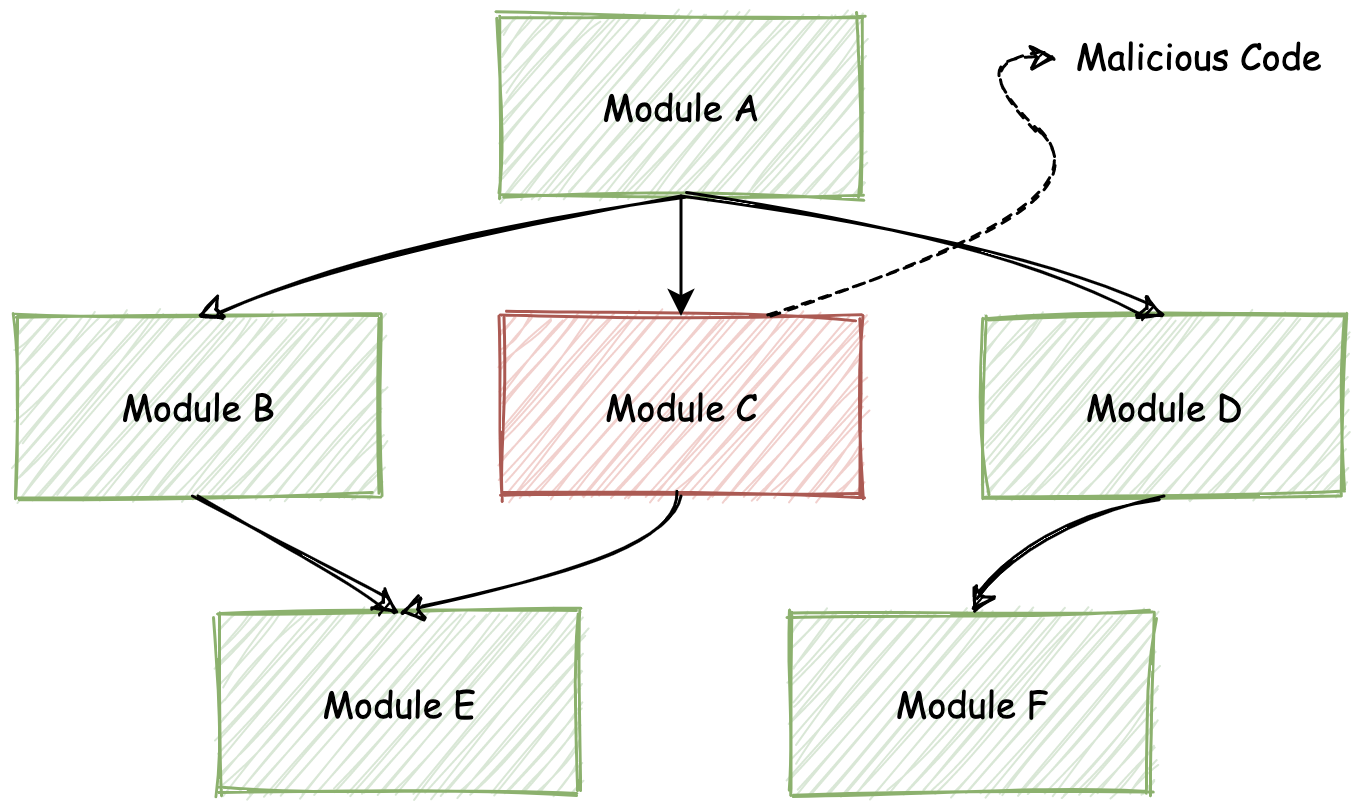 当一个含有恶意代码的 Wasm 模块被“链接”到整个应用的依赖树中时,应用各依赖模块所能够使用的资源及系统接口权限,便全部来自于最上层的调用者。也就是说需要在应用运行的入口模块中被指定,然后再由该模块向下层依赖模块进行分发。