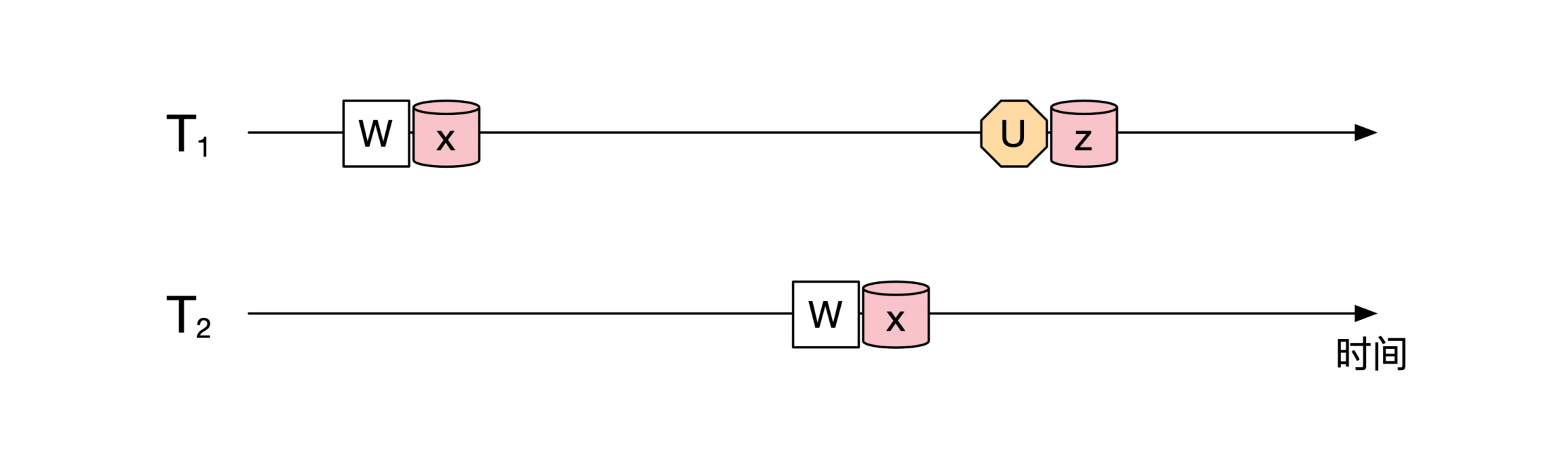 假设所有事务中第一个释放锁的是第一个事务 T1 ,释放的锁是 z 。和它冲突的是第二个事务,冲突在 x 。那有没有可能出现下面这幅图的情况呢?