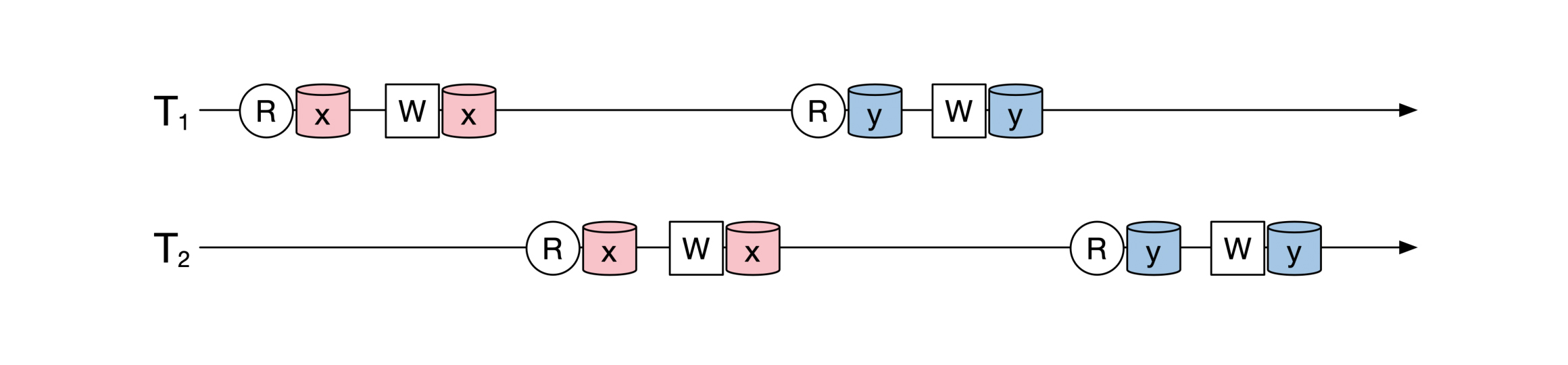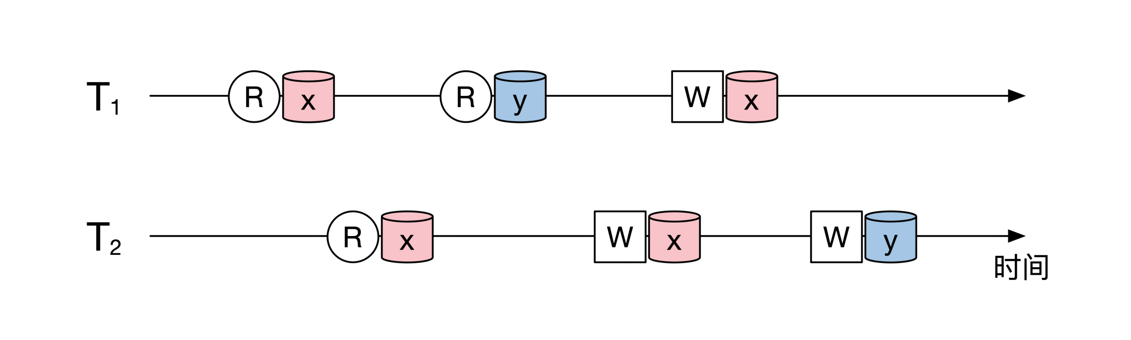 有很多人会对这些资源做读或者写的操作。每个人的操作叫作事务,我们用 T来表示。所以一个事务T里会有一系列读写操作。下面是一个时序图,展示了两个事务随着时间推移的情况: