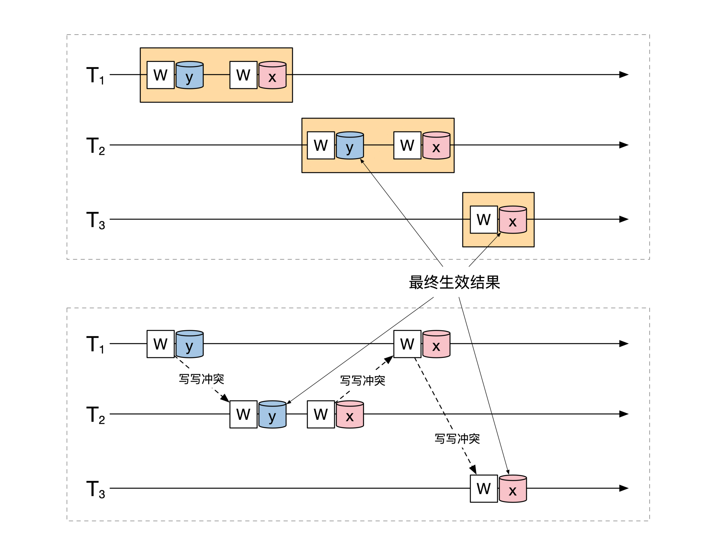 最低的隔离级别 Read Uncommitted 解决了脏写(Dirty Write)的问题。脏写指的是两个事务写了同一份资源,这样后写的事务会覆盖先写的内容。其实脏写就是上面提到的写写冲突,示意图如下: