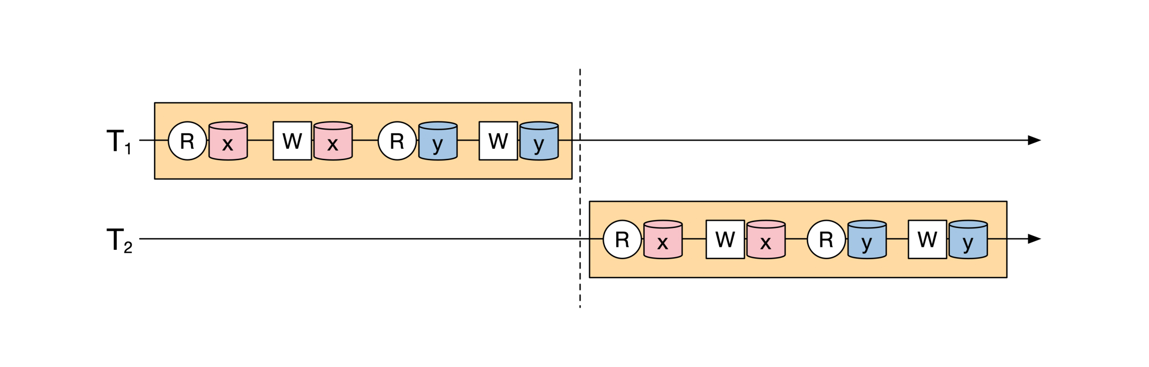 这个定义比较拗口,让我们来逐一分解。首先,我们看看什么叫“顺序执行”。比如下面的图上有两个事务,这两个事务交互地读写 x 和 y :