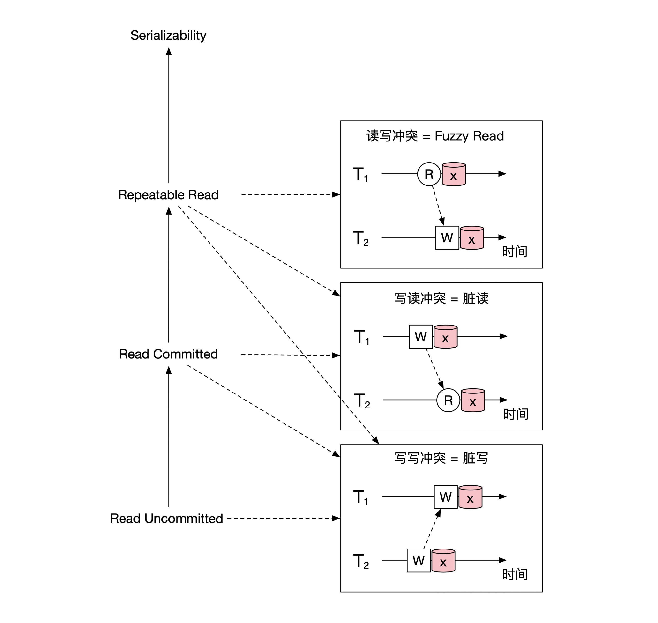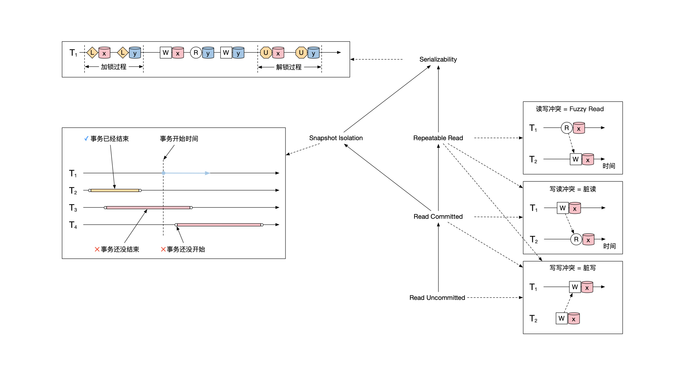 原因是读的事务如果再读一次的话,会将另一个事务写入的值读回来,因此前后两次读到的结果会不一致。示意图如下: