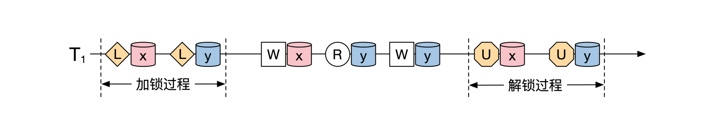 我们用 L 来表示加锁, U 来表示解锁。下面这张图展示了一个事务在2PL的情况下的加锁解锁过程: