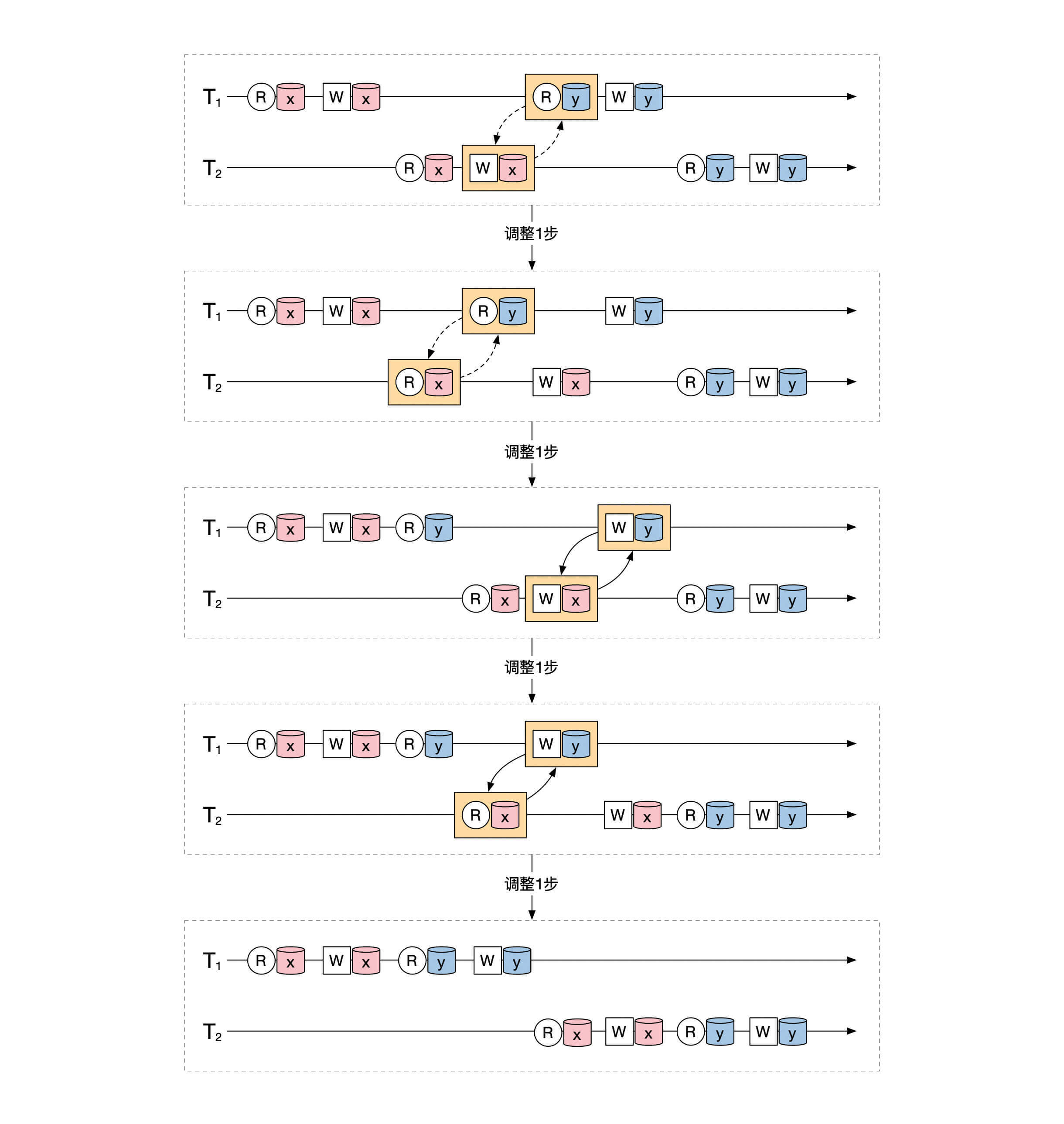 接下来,我们可以用同样的操作把剩下的事务一个一个向前调整,最终把所有事务分解为串行化的执行过程。