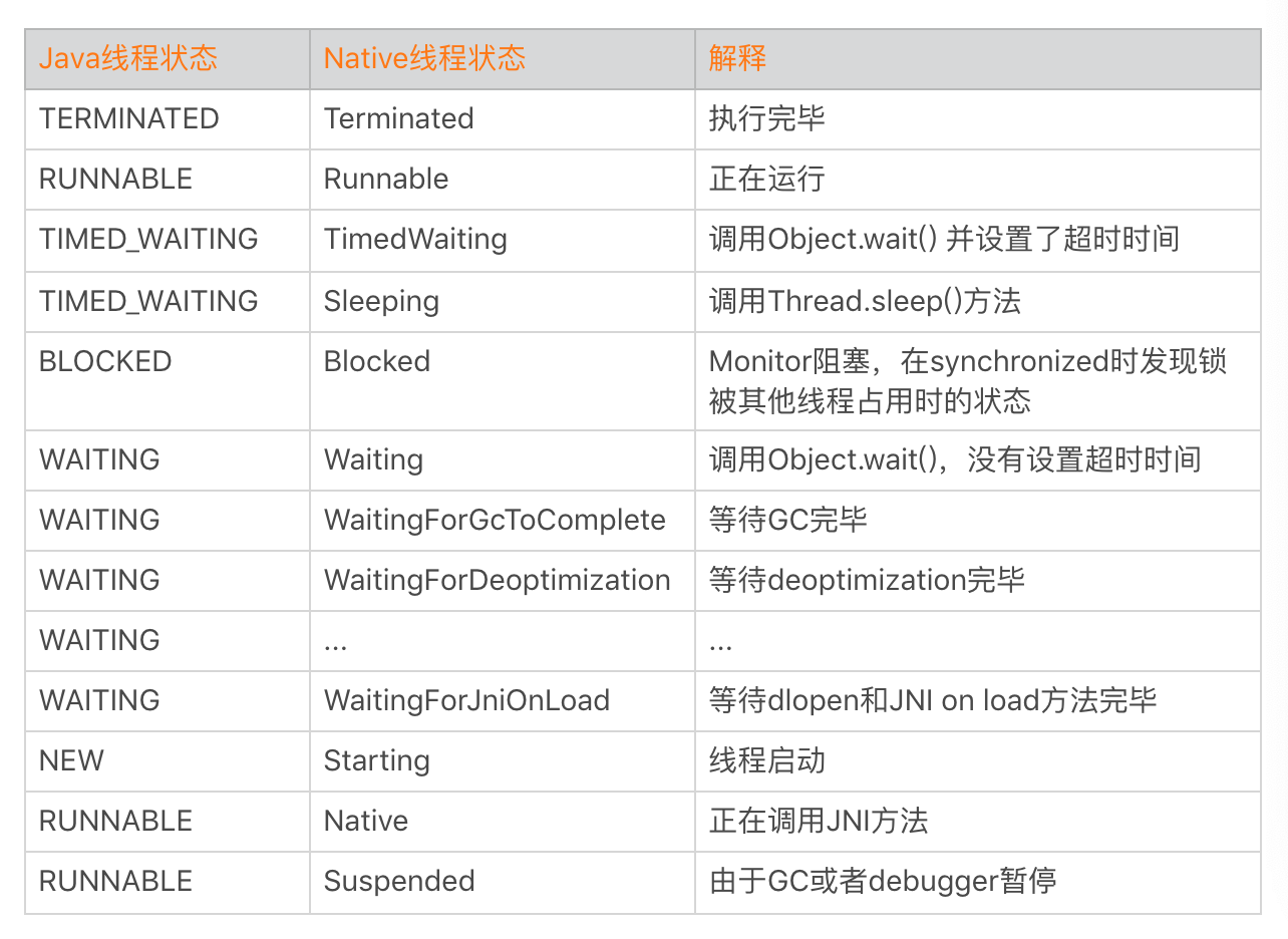 我们可以看到Native线程状态的确更加丰富,例如将TIMED_WAITING拆分成TimedWaiting和Sleeping两种场景,而WAITING更是细化到十几种场景等,这对我们分析特定场景问题的时候会有非常大的帮助。