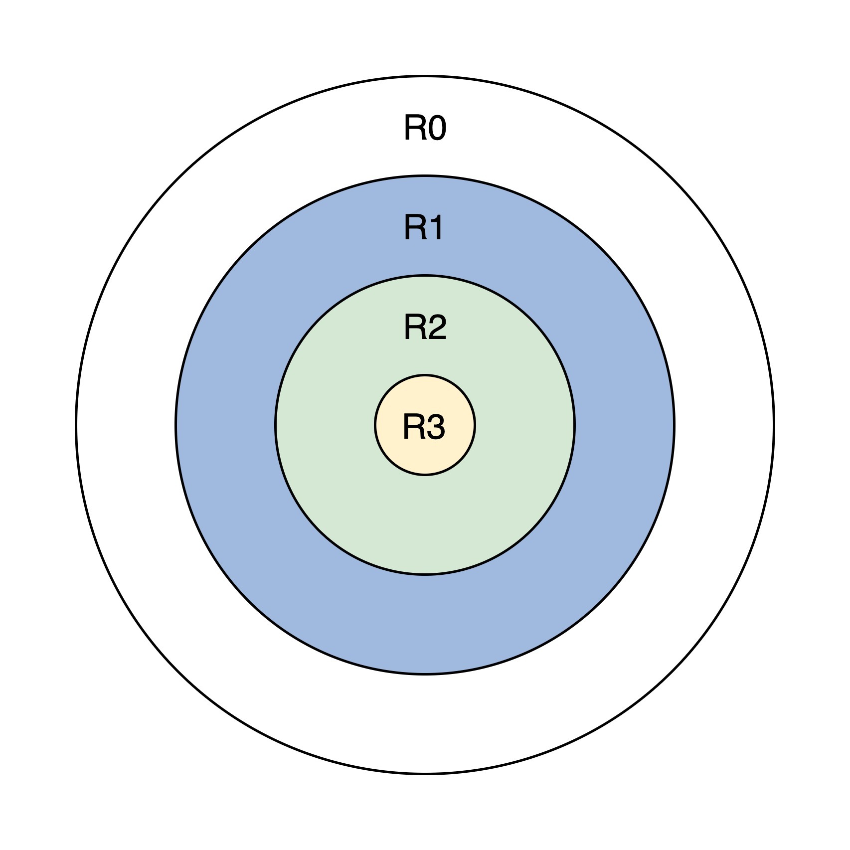 **上面的圆环图,从外到内,既能体现权力的大小,又能体现各特权级对资源控制访问的多少,还能体现各特权级之间的包含关系。**R0拥有最大权力,可以访问低特权级的资源,反之则不行。