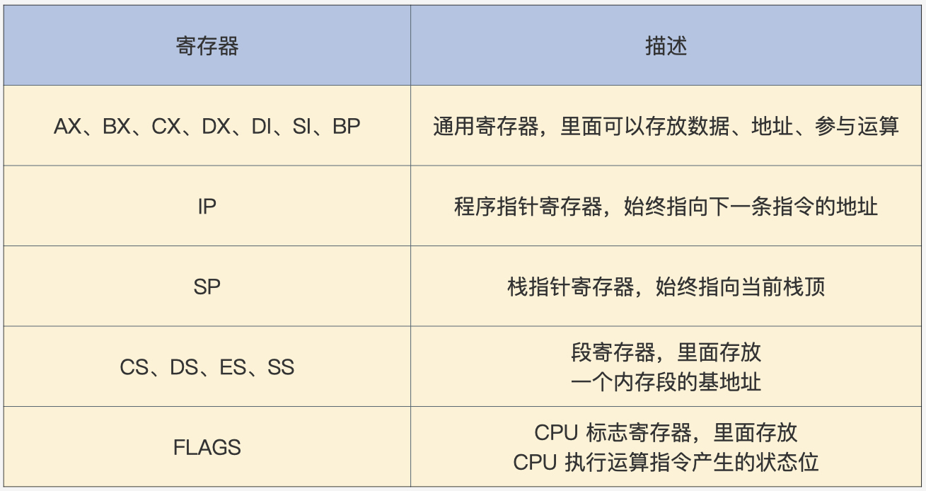 下面我们就去看看x86 CPU在实模式下的寄存器。表中每个寄存器都是16位的。