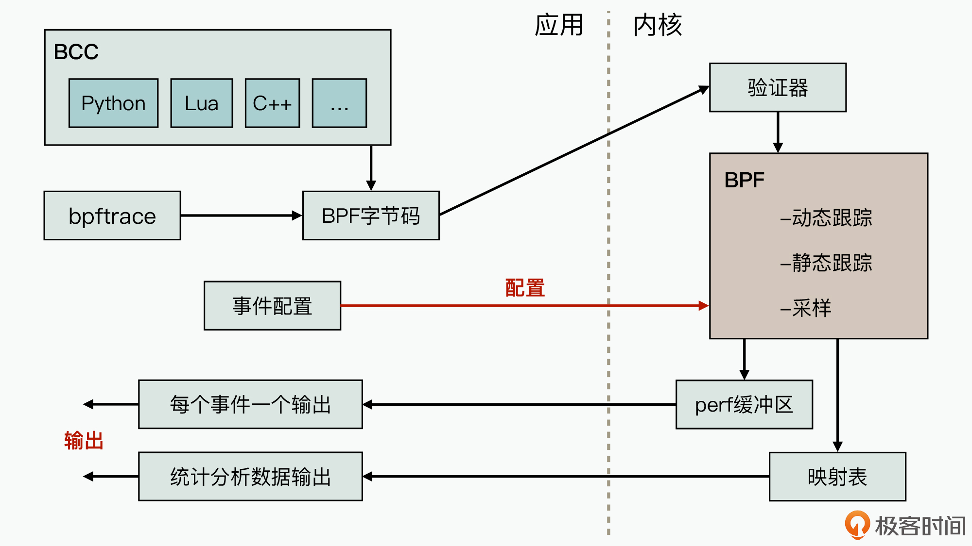另外,在软件系统运行过程中,我们还可以不断地通过动态配置的方式来修改观测行为。同时,内核态的eBPF引擎在获取到各种跟踪观测数据后,可以直接对数据进行加工处理,然后通过perf缓冲区和映射表数据结构,将处理后的数据再传输给应用态的监控工具。