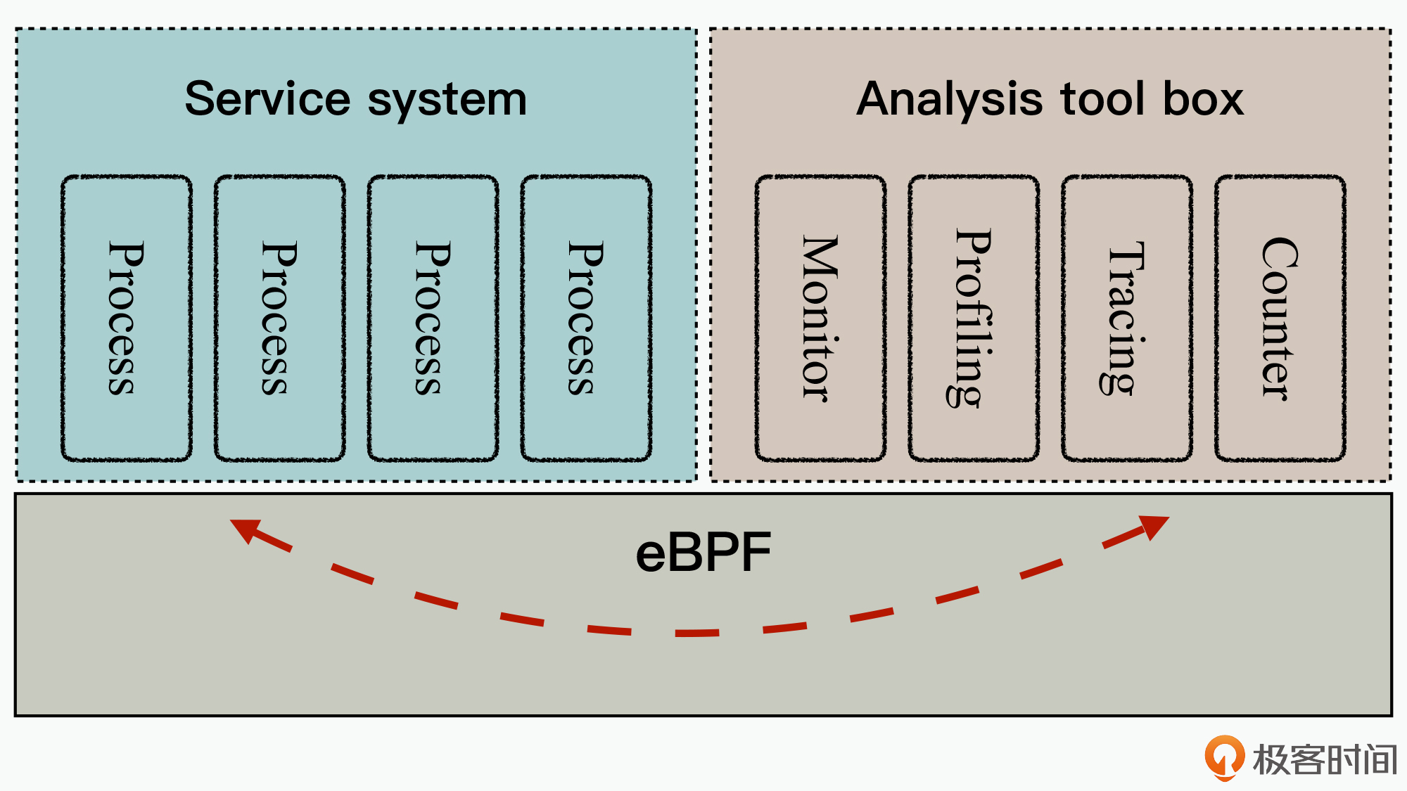 可以看到,在这个图中主要分为三个大块,其中Service system代表了我们的业务系统,Analysis tool box代表对业务系统的监控与分析工具箱,它们之间可以基于eBPF技术这个桥梁,实现高效互通。