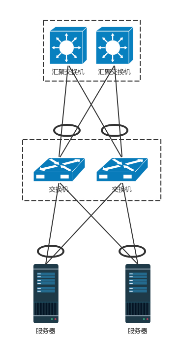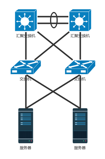 网卡有了高可用保证,但交换机还有问题。如果一个机架只有一个交换机,它挂了,那整个机架都不能上网了。因而TOR交换机也需要高可用,同理接入层和汇聚层的连接也需要高可用性,也不能单线连着。