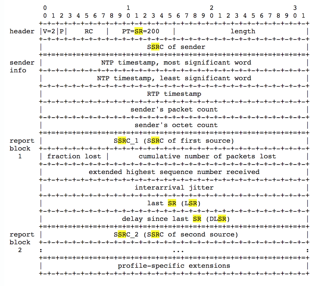 RTCP 支持的所有报文及其含义可以查看文章最后所附的参考一节。这里我们以SR报文为例,看看 SR 报文中都包括哪些信息。