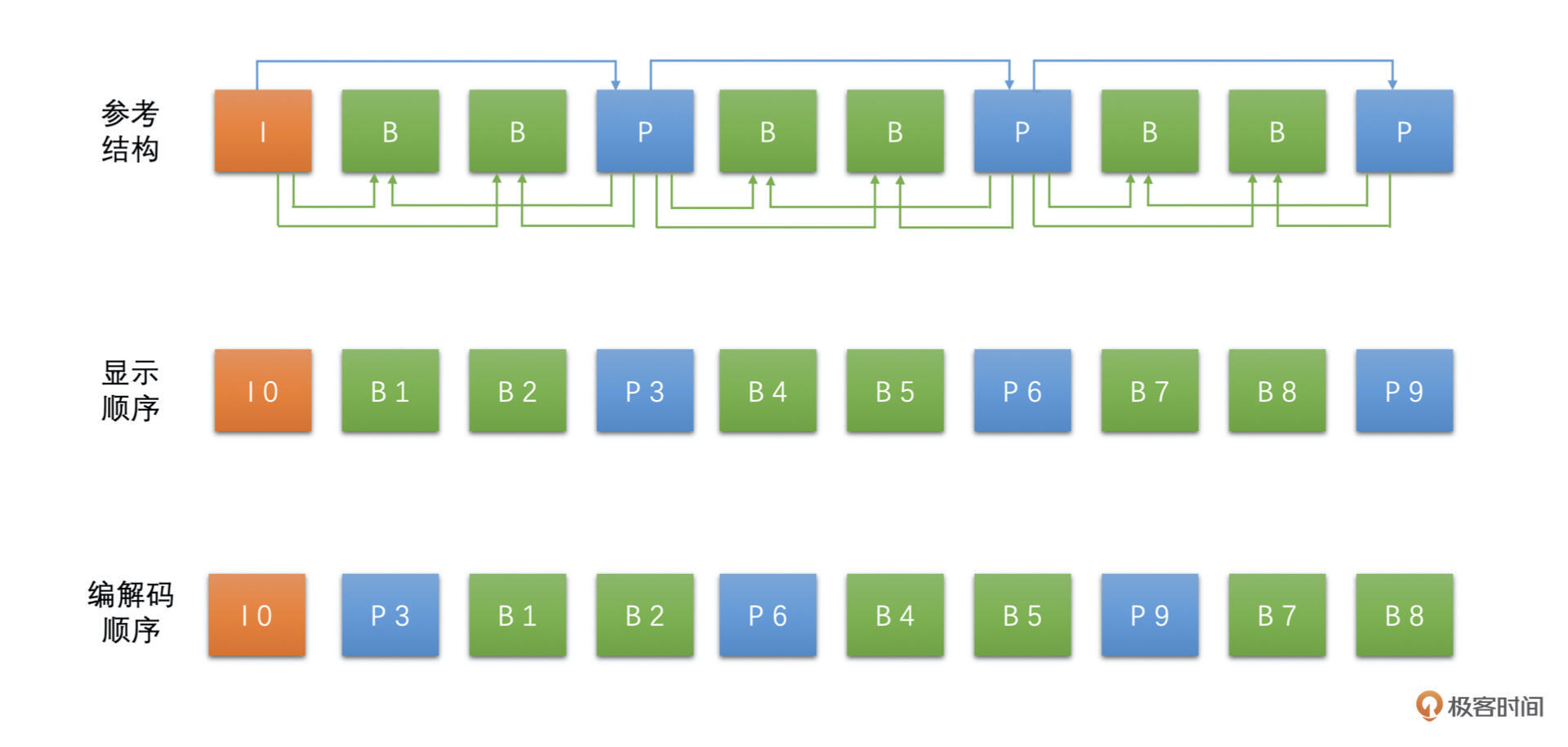 为什么呢?主要的原因是B帧,因为B帧可以双向参考,可以参考后面的P帧,那么就需要将后面用作参考的P帧先编码或解码,然后才能进行B帧的编码和解码。所以就会导致一个现象,后面显示的帧需要先编码或解码,这样就有解码时间和显示时间不同的问题了。如果说没有B帧的话,只有I帧和P帧就不会有PTS和DTS不同的问题了。