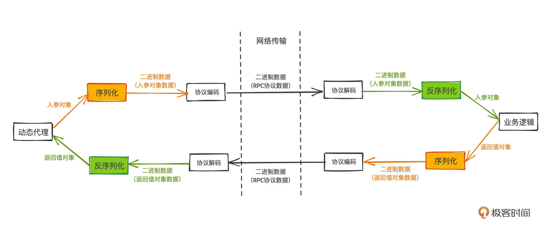 为什么要经过序列化和反序列化过程,本质上是因为网络传输的是二进制,而方法调用的参数和返回值是编程语言中定义的对象,要实现远程过程调用,序列化和反序列化过程是不可避免的环节。