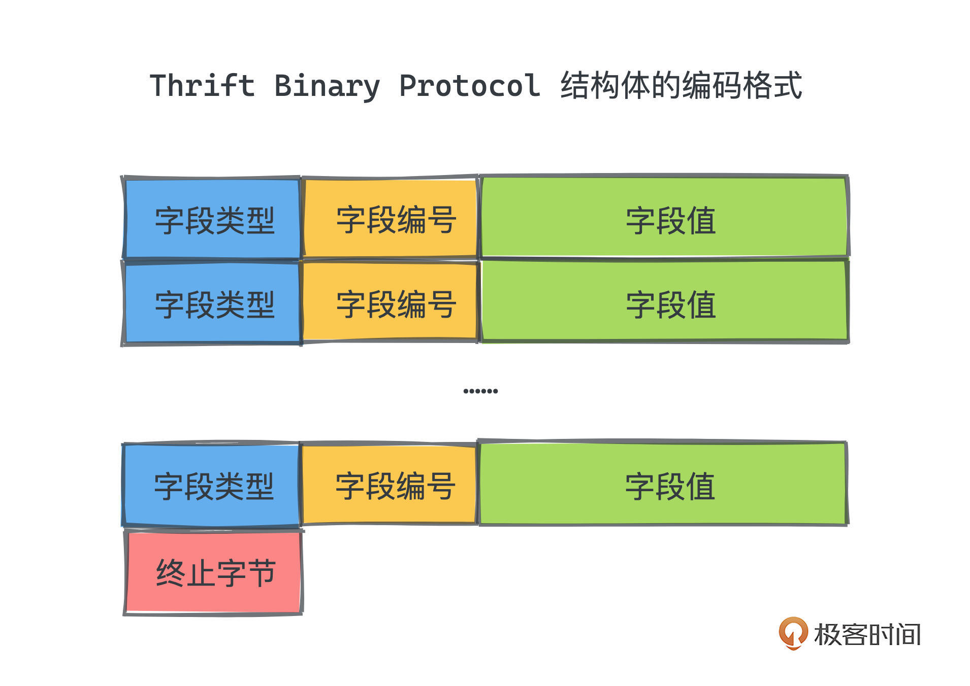 那有了schema,在序列化的时候,我们自然就不需要再使用冗长的字段名了。每个序列化后的struct,二进制大约是一组连续排列的字段类型+编号+字段值: