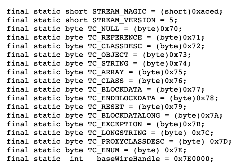 这种特定的翻译协议,在JDK中,也就是默认的序列化协议,它有一个非常清晰的文档。因为Java类型比较丰富,又支持类型的嵌套,协议比较复杂,这里我就简单介绍一下。