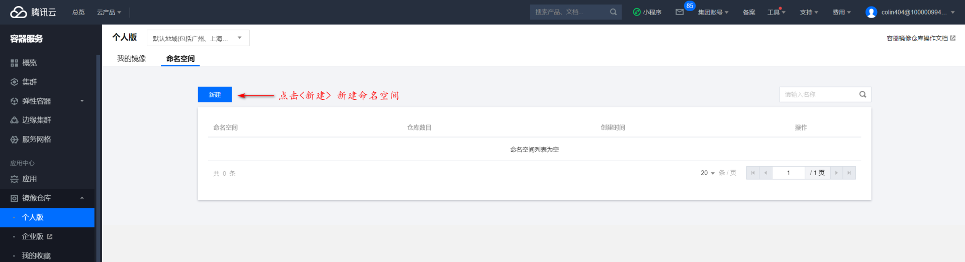 如果想使用镜像仓库,那么你首先需要创建一个用来创建镜像的命名空间。上一步,我们开通了镜像仓库,就可以在“命名空间”页签新建命名空间了,如下图所示:
