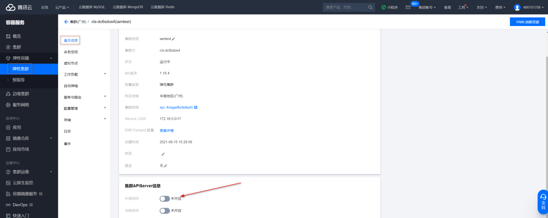 登录容器服务控制台 -> 选择左侧导航栏中的【弹性集群】 -> 进入cls-dc6sdos4 集群的详情页中 -> 选择【基本信息】 -> 点击【外网访问】按钮。如下图所示: