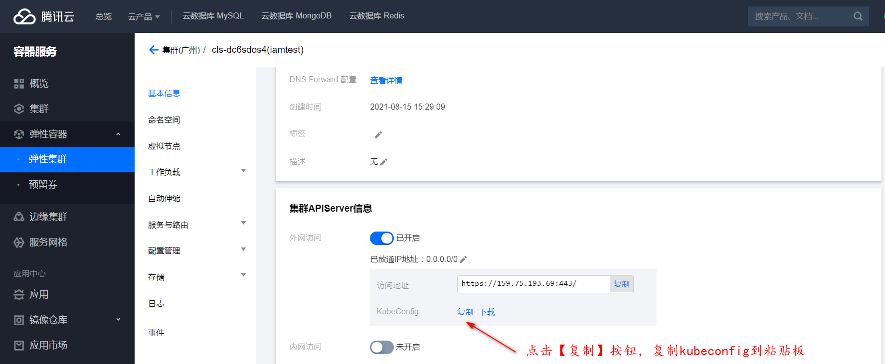 在弹性集群的基本信息页面,点击【复制】按钮,复制kubeconfig文件内容,如下图所示: