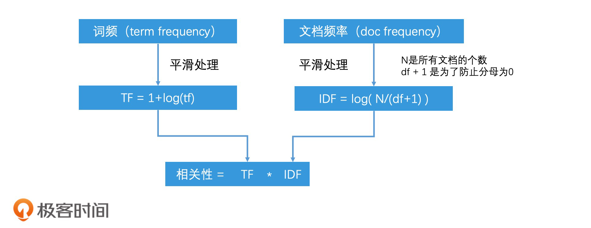 因此, TF*IDF表示了我们综合考虑了一个词项的重要性和区分度,结合这两个维度,我们就计算出了一个词项和文档的相关性。不过,在计算的过程中,我们会对TF和IDF的值都使用对数函数进行平滑处理。处理过程如下图所示: