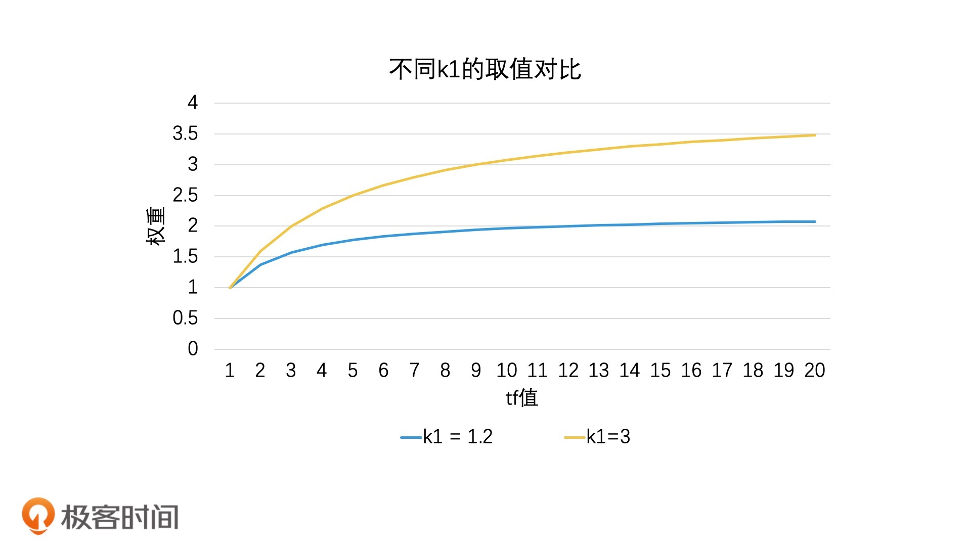 在这个公式中,随着tf的值逐步变大,权重会趋向于k1 + 1这个固定的阈值上限(将公式的分子分母同时除以tf,就能看出这个上限)。其中,k1是可以人工调整的参数。k1越大,权重上限越大,收敛速度越慢,表示tf越重要。在极端情况下,也就是当k1 = 0时,就表示tf不重要。比如,在下图中,当k1 = 3就比k1 = 1.2时的权重上限要高很多。那按照经验来说,我们会把k1设为1.2。
