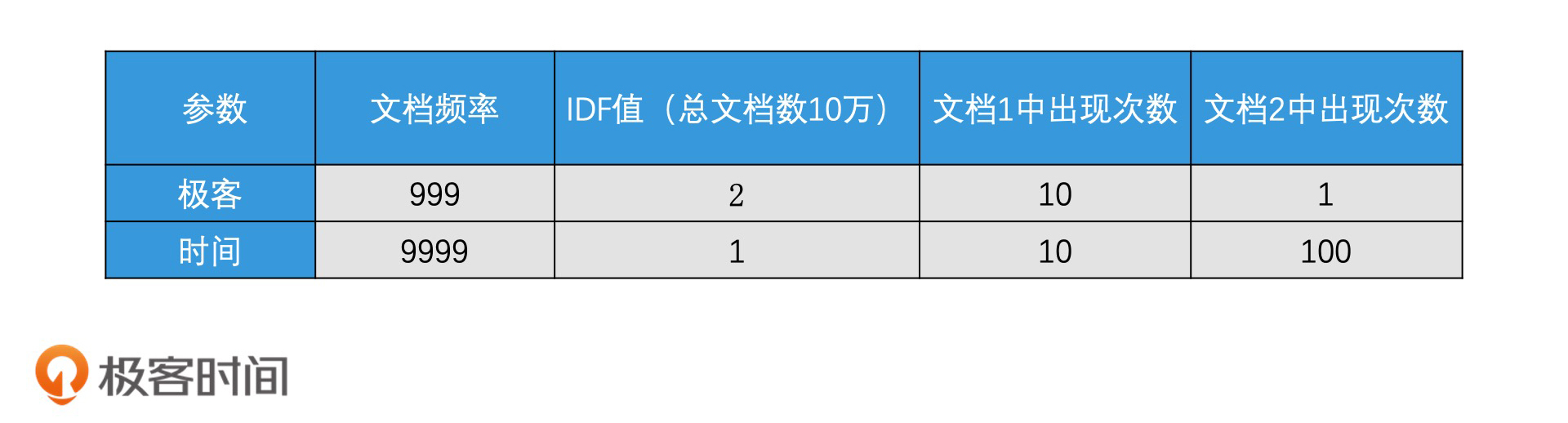 这么说可能比较抽象,我列举了一些具体的数字,我们一起动手来计算一下相关性。假设查询词是“极客时间”,它被分成了两个词项“极客”和“时间”。现在有两个文档都包含了“极客”和“时间”,在文档1中,“极客”出现了10次,“时间”出现了10次。而在文档2中,“极客”出现了1次,“时间”出现了100次。