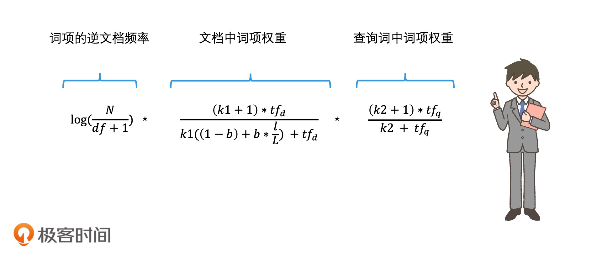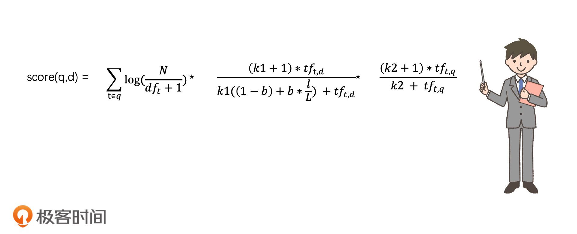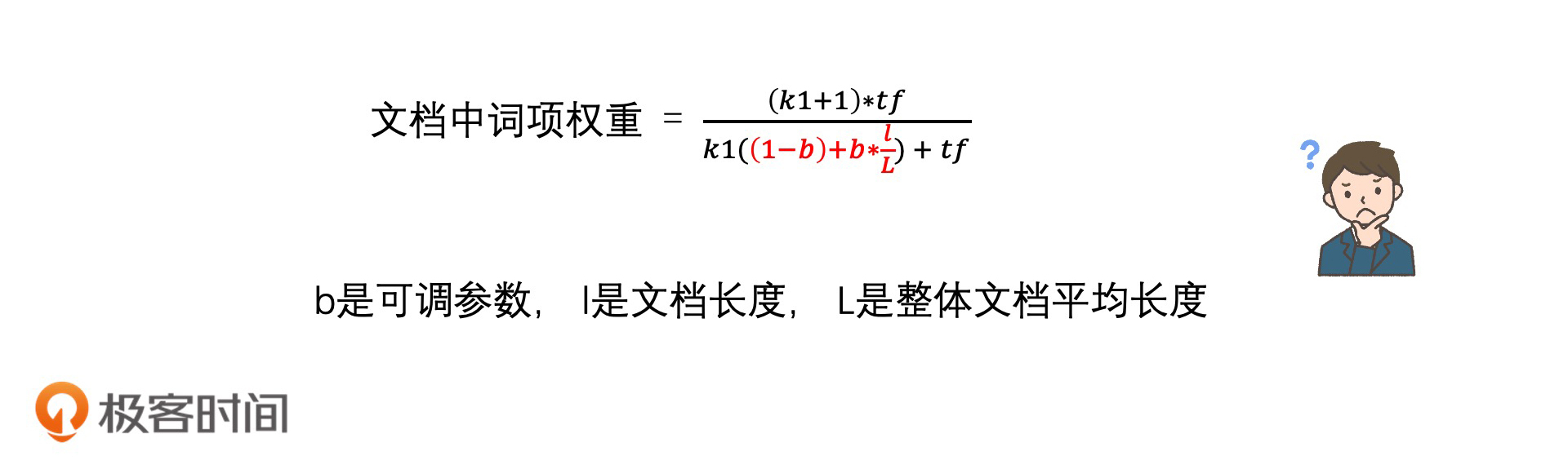 这个公式中除了k1,还有一个可以人工调整的参数b。它的取值范围是0到1,它 代表了文档长度的重要性。当b取0时,我们可以完全不考虑文档长度的影响;而当b取1时,k1的重要性要按照文档长度进行等比例缩放。按照经验,我们会把b设置为0.75,这样的计算效果会比较好。