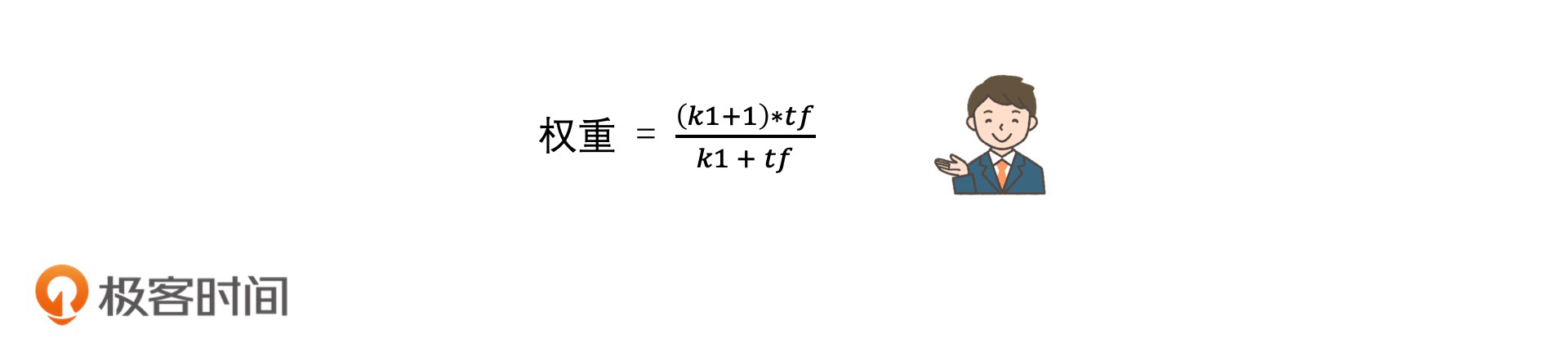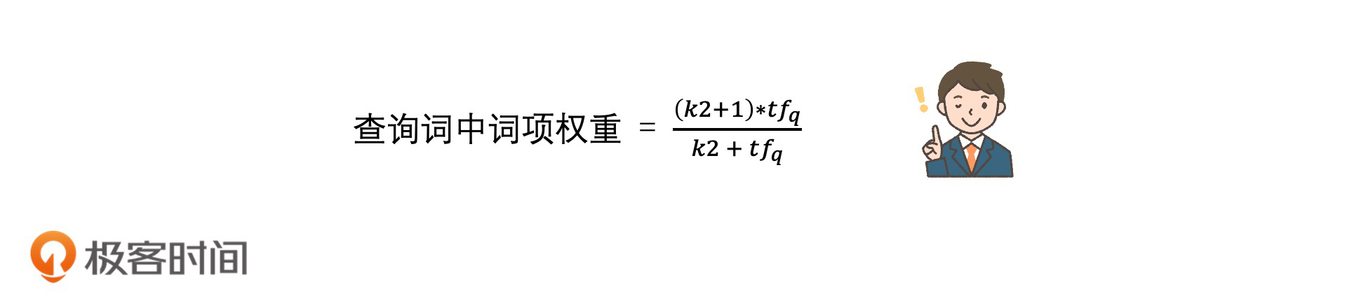 除此以外,如果查询词比较复杂,比如说一个词项会重复出现,那我们也可以把它看作是一个短文档,用类似的方法计算词项在查询词中的权重。举个例子,如果我们的查询词是“极客们的极客时间课程”,那么“极客”这个词项,其实在查询词中就出现了两次,它的权重应该比“时间”“课程”这些只出现一次的词项更重要。因此,BM25对词项在查询词中的权重计算公式如下: