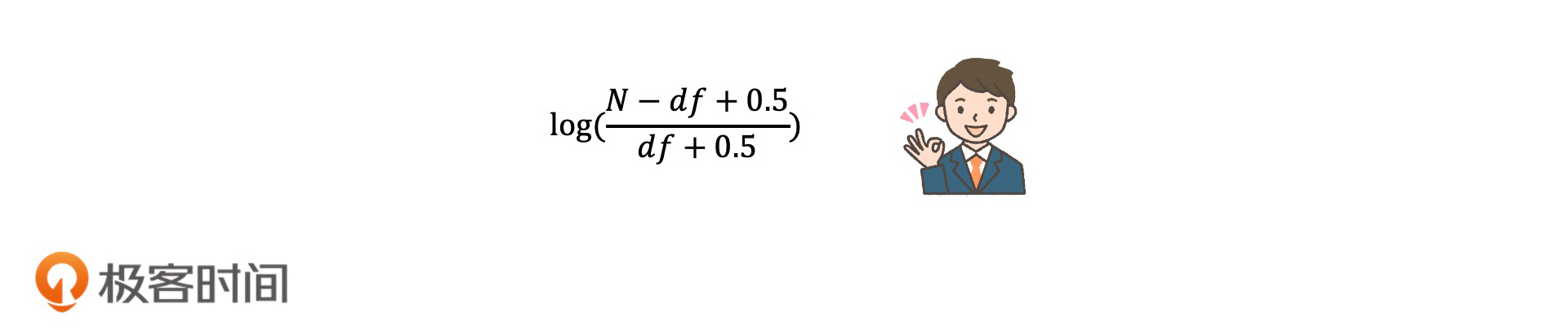这就是完整的BM25算法的表达式了。尽管这个公式看起来比较复杂,但是经过我们刚才一步一步的拆解,你应该可以很好地理解它了,它其实就是对TF-IDF的算法中的TF做了更细致的处理而已。其实,BM25中的IDF的部分,我们也还可以优化,比如,基于二值独立模型对它进行退化处理(这是另一个分析相关性的模型,这里就不具体展开说了)之后,我们就可以得到一个和IDF相似的优化表示,公式如下: