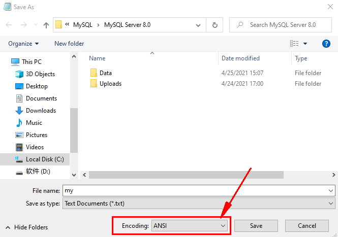 记事本保存文件默认的码制是UTF-8,但配置文件的码制必须是ANSI才行。所以,当你修改完MySQL的配置文件my.ini之后,保存的时候,记得用ANSI的格式。如下图所示: