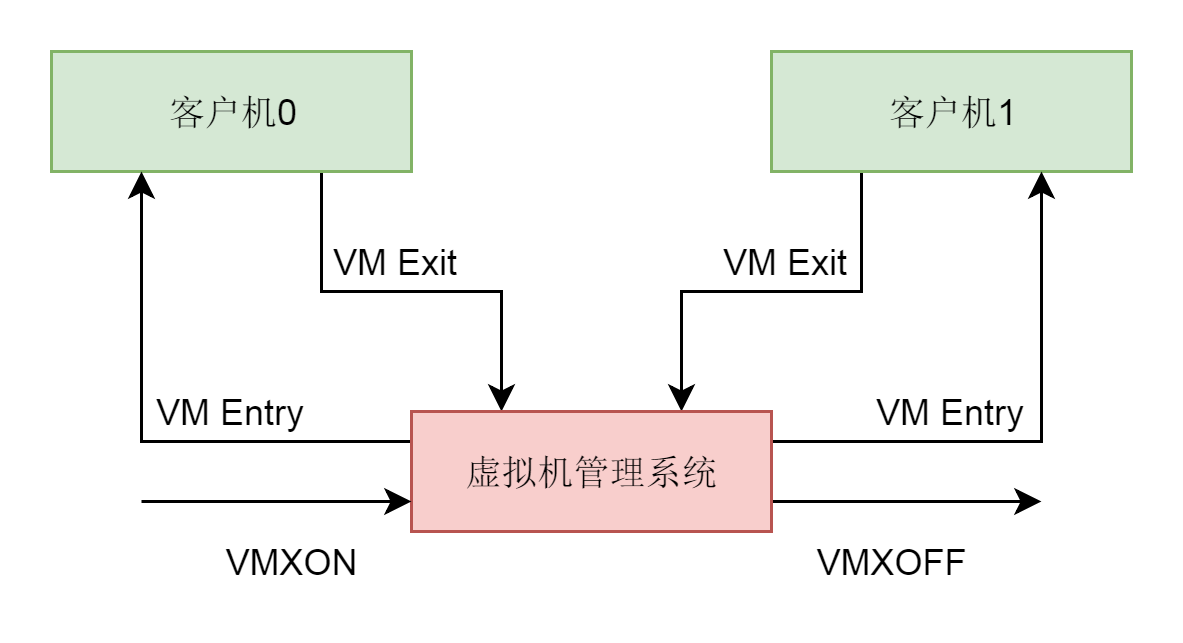 VM-Entry,我们称为从根模式切换到非根模式,也即切换到guest上,这个时候CPU上运行的是虚拟机。VM-Exit我们称为CPU从非根模式切换到根模式,也即从guest切换到宿主机。例如,当要执行一些虚拟机没有权限的敏感指令时。