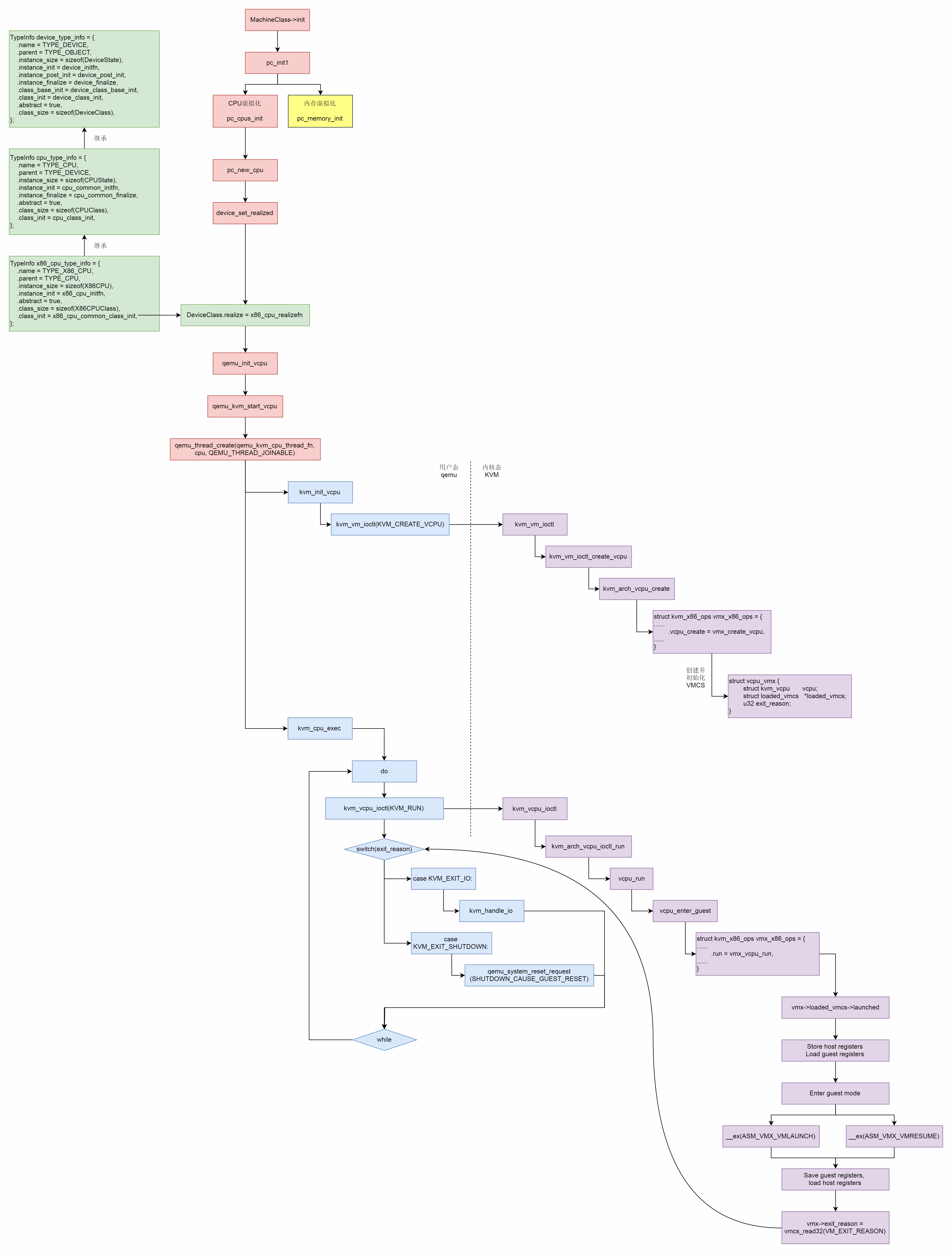 在kvm_cpu_exec中,我们能看到一个循环,在循环中,kvm_vcpu_ioctl(KVM_RUN)运行这个虚拟机,这个时候CPU进入VM-Entry,也即进入客户机模式。