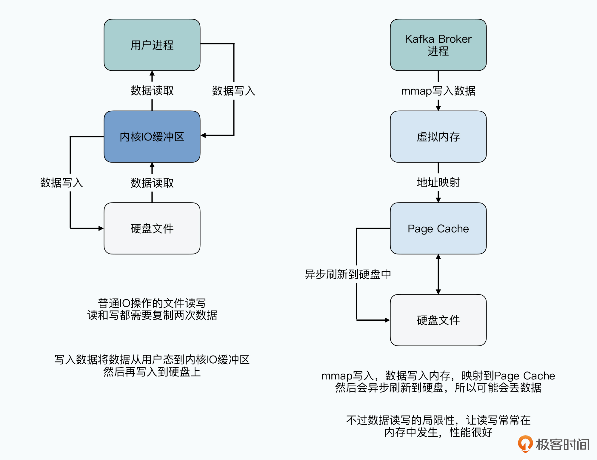 **第一个是JVM里面的GC(垃圾回收)的开销。**如果我们有大量的消息是缓存在内存里,那么处理完了之后,就需要通过GC销毁这些对象,腾出空间来容纳新的需要缓存的对象,而JVM的GC开销,可能会短时间大幅度影响Broker的性能。