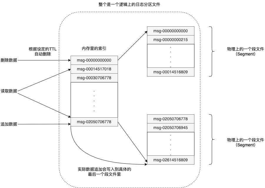 在实际的实现上,Kafka是这么做的。每一个Topic会有很多个Partition,分布到不同的物理机器上。一个物理机上,可能会分配到多个Partition。实际存储的时候,我们的一个Partition是一个逻辑上的日志文件。在物理上,这个日志文件会给实现成一组大小基本相同的Segment文件,比如每个Segment是1GB大小。每当有新消息从Producer发过来的时候,Broker就会把消息追加写入到最后那个Segment文件里。