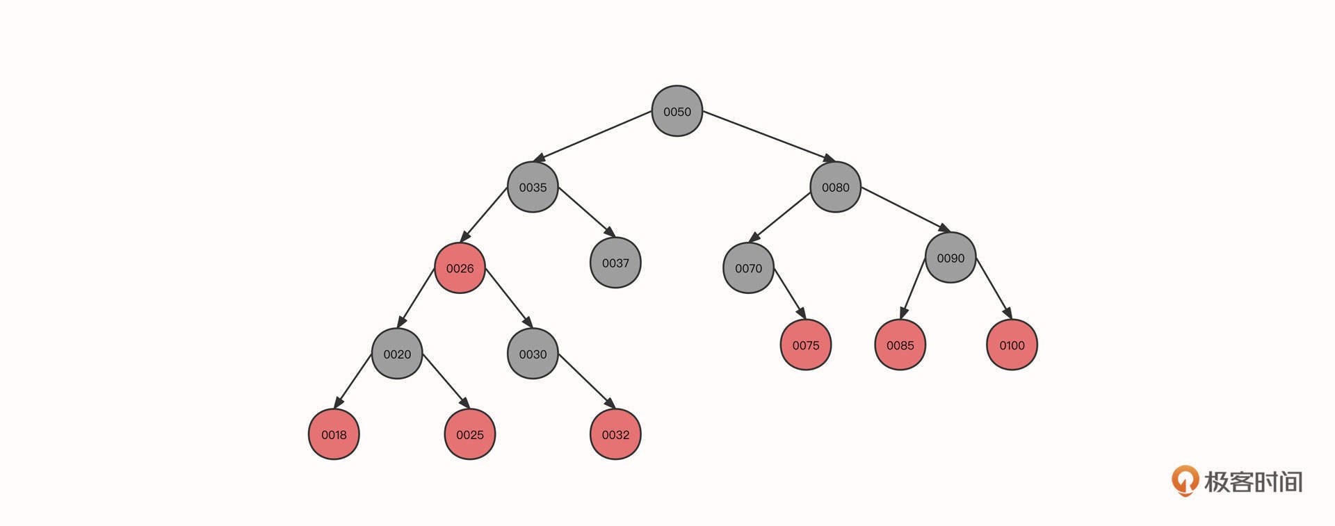 提前说明一下,由于从小到大排序是一种特殊情况,不能覆盖建构红黑树的多种情况,所以为了更好地说明红黑树的工作机制,我们把节点的插入顺序变更为50、37、70、35、25、30、26、80、90、100、20、18、32、75、85。