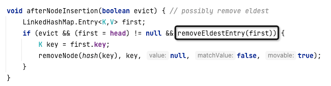 可以看到,默认返回的是false,表示LinkedHashMap并不会启用节点的淘汰机制。为了实现LRU算法,我们需要继承LinkedHashMap并重写该方法,具体实现代码如下: