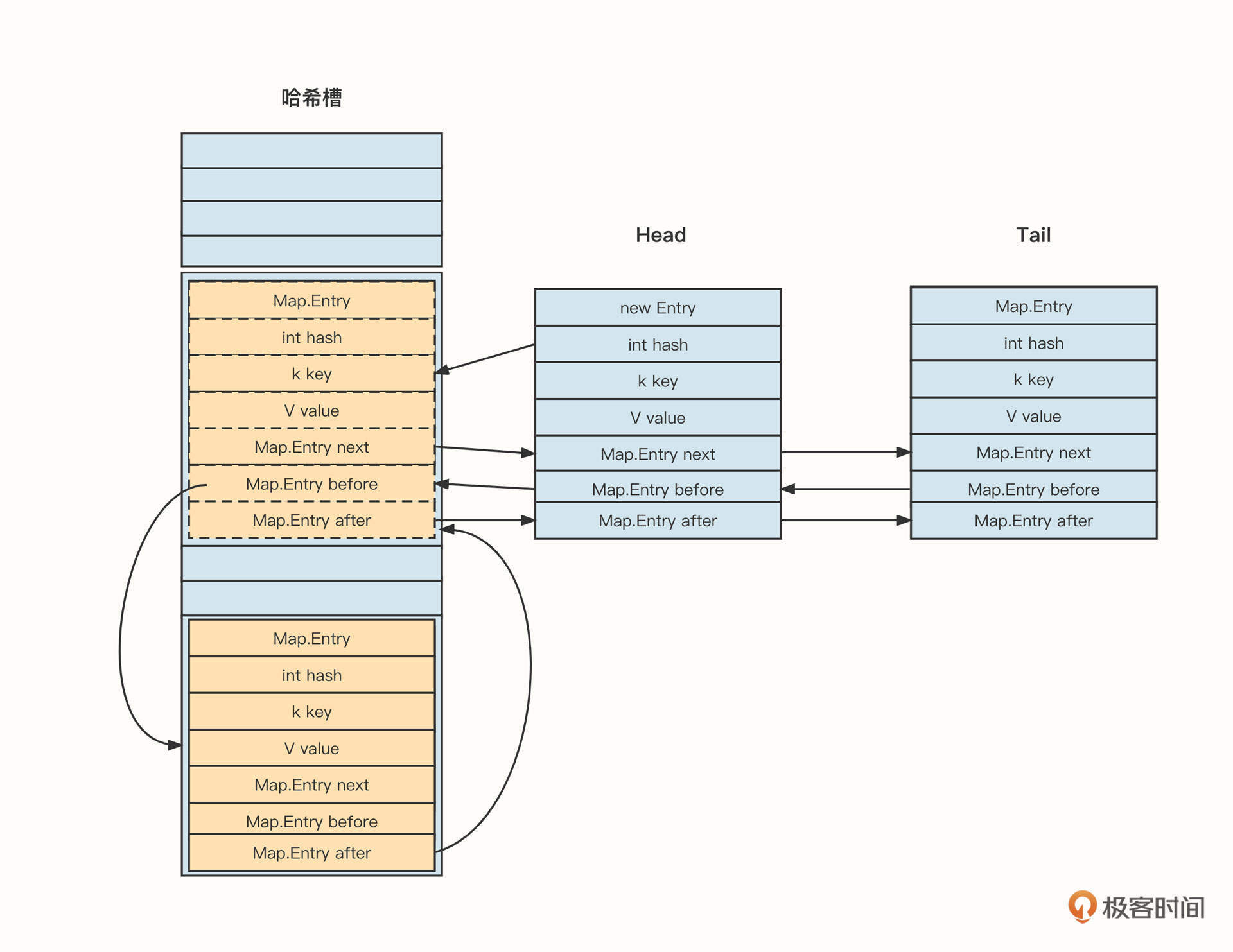 LinkedHashMap内部存储的Entry在HashMap的基础上增加了两个指针:before和after。这两个节点可以对插入的节点进行链接,以此来维护顺序性。同时,链表结构为了方便插入,也会持有“头尾节点”这两个指针。