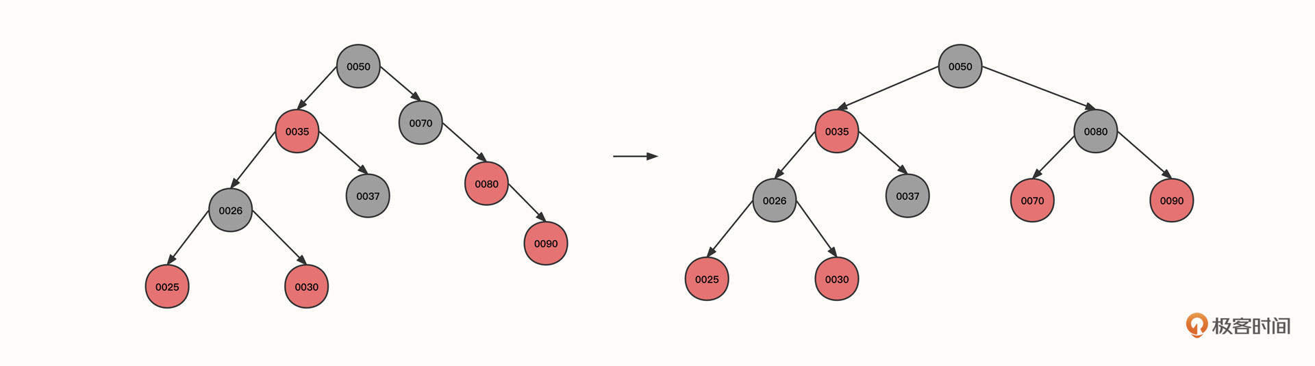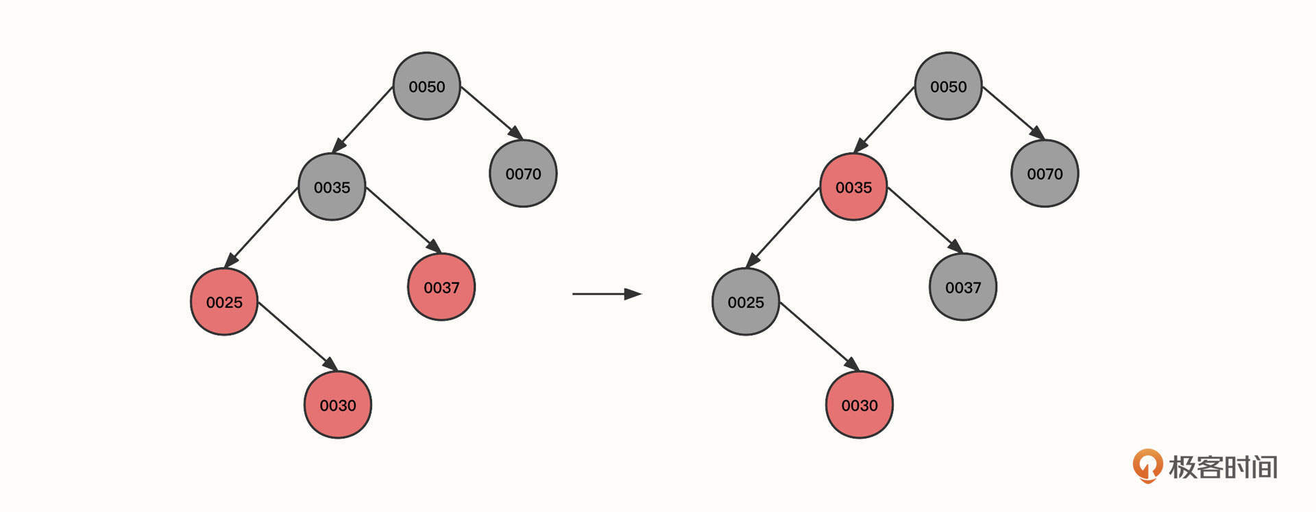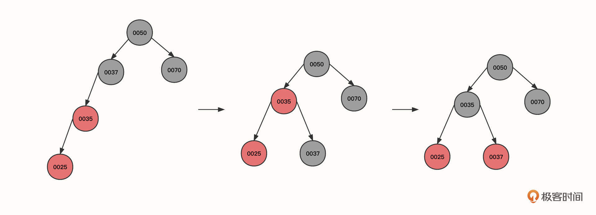 - 让当前节点(0025)的祖先节点(0037)下沉,作为当前节点的父节点(0035)的右子节点。同时,当前父节点(0025)的祖先节点(0050)的左节点指向当前节点的父节点,这样,0050的左节点就直接指向了0035。本轮操作后变成图里的第二个状态。