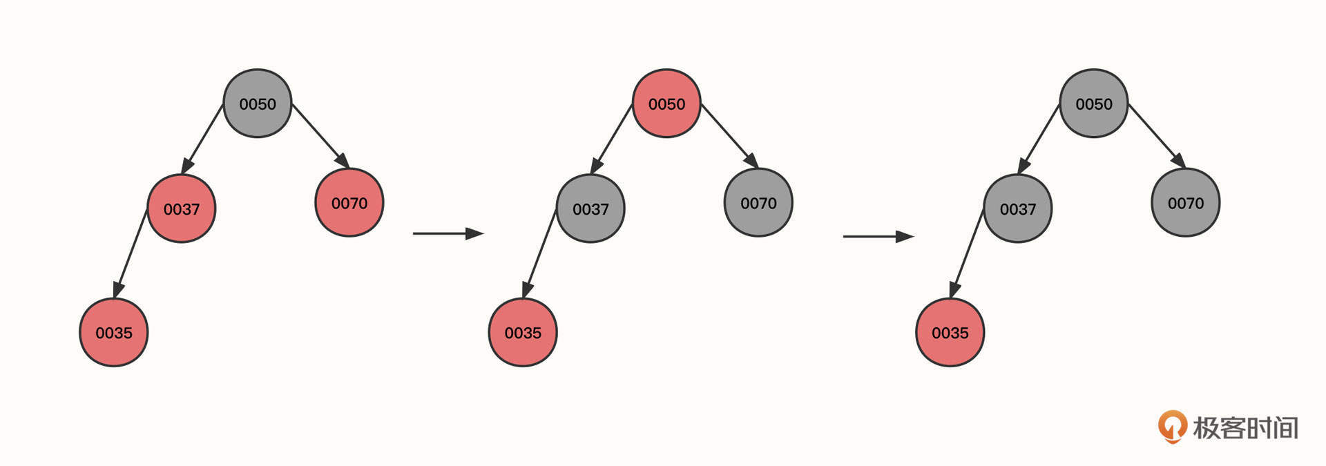 - 旋转之后0035节点的右子树路径多了一个黑色的节点0037,为了符合红黑树的特性,我们需要将0037父节点的颜色进行翻转,变成图里的第三个状态。