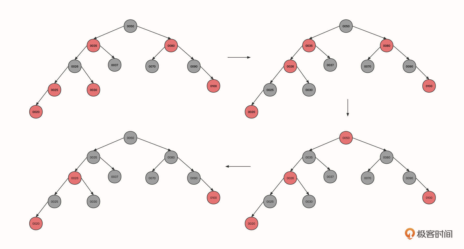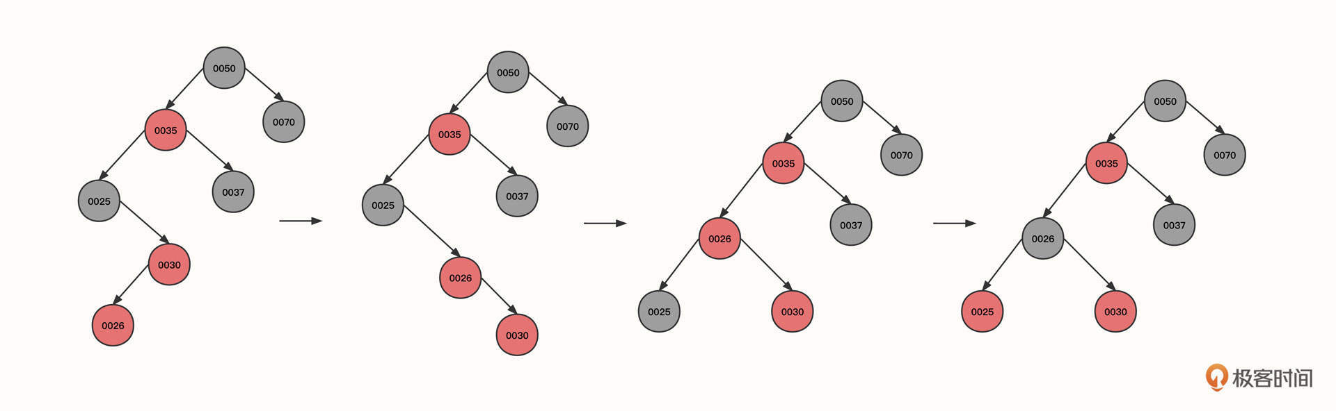 左旋之后,黑色节点0025变成了节点0026的左子树,左子树的黑色节点数量变多,所以我们需要将黑色传递到父节点,也就是要把节点0025变为红色,0026变为黑色,变成图中的第四个状态。